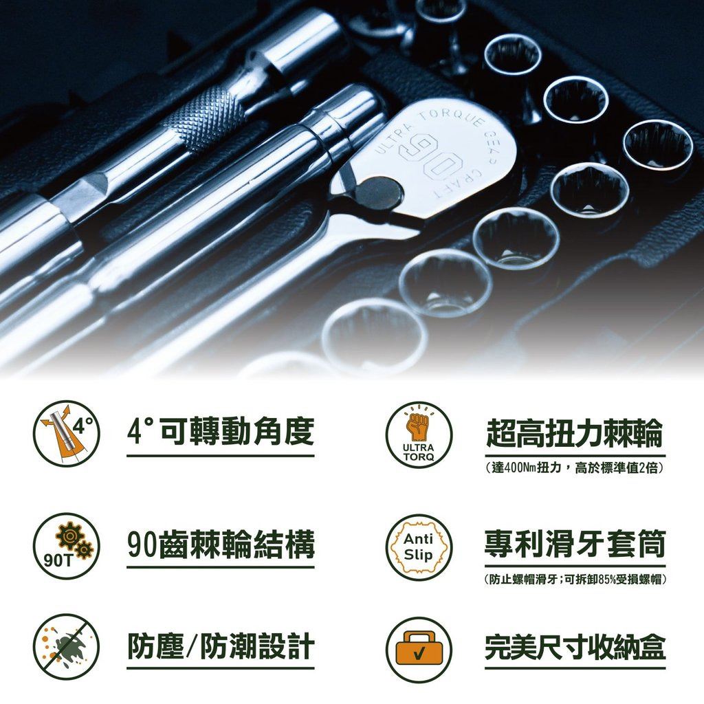 產品名: 19PC 3/8” Dr 90齒超扭力止滑套筒組 (三分)